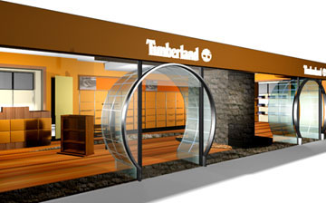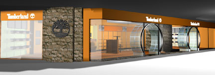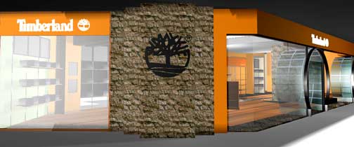 Illuminated 3D white acrylic Timberland text & logo on spray painted orange background |